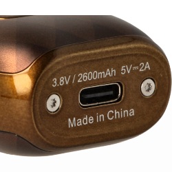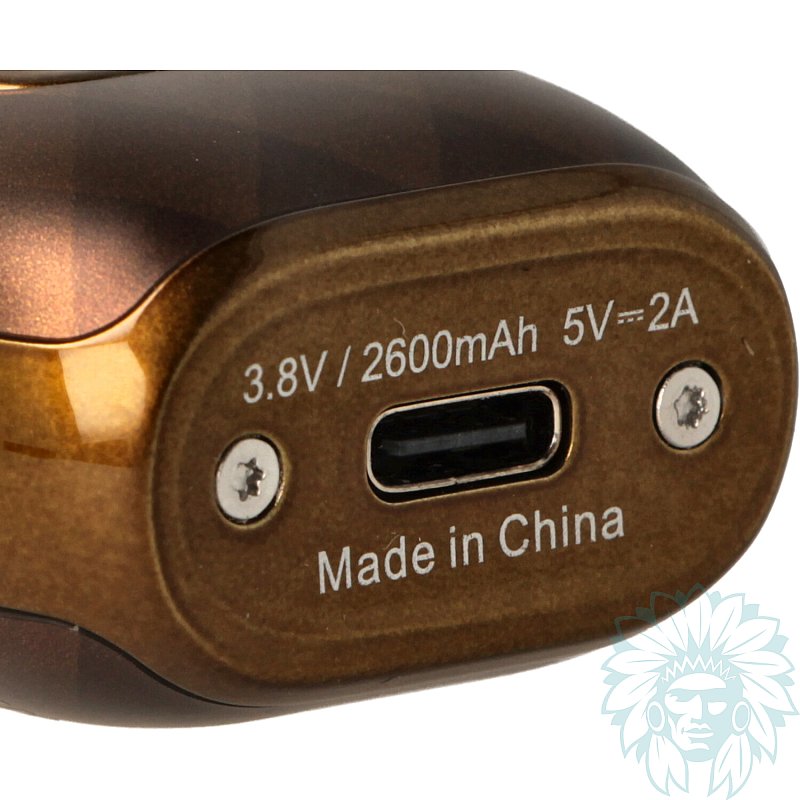 The USB C (2A) charging socket is located on the underside of the box. With its variable power, the battery can deliver up to 60 W and a long operating life of 2,600 mAh. The high wattage ensures a richly flavoured vape with a very dense, airy vapor.