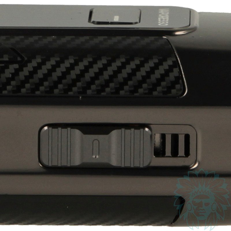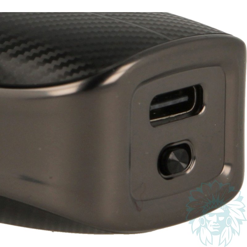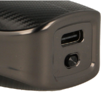 The front panel features a switch button, a 0.8" digital display and an LED strip. The display shows the remaining battery level as well as the power in watts when using or installing a cartridge.
